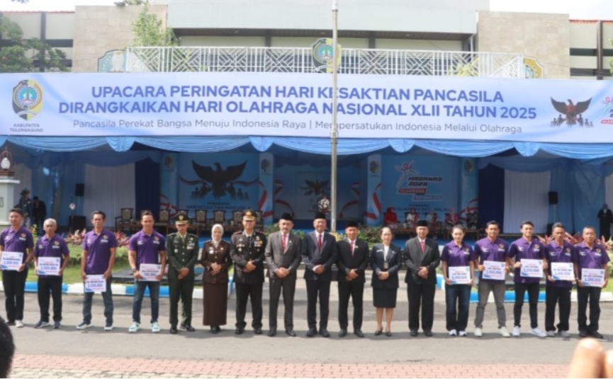 suaramerahputih.id // TULUNGAGUNG – Peringatan Hari Kesaktian Pancasila yang dipadukan dengan Hari Olahraga Nasional (Haornas) ke-42 berlangsung khidmat di halaman Kantor Bupati Tulungagung, Rabu (1/10/2025). Kegiatan ini diikuti jajaran Forkopimda, TNI-Polri, kepala OPD, purnawirawan, hingga pelajar tingkat SMP dan SMA se-Kabupaten Tulungagung.