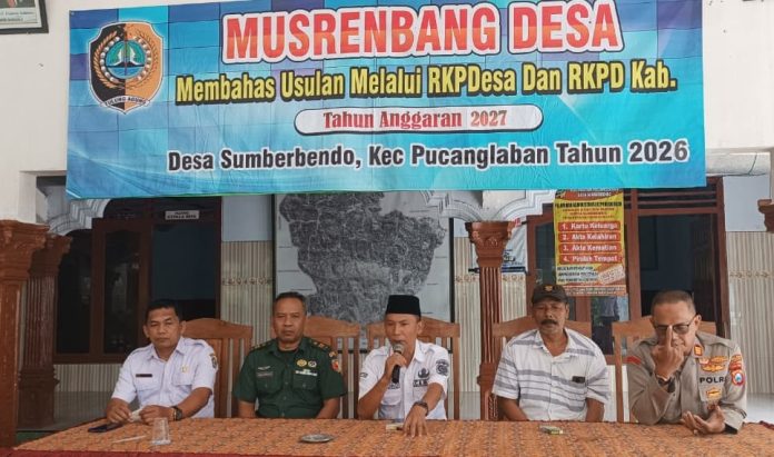 suaramerahputih.id // TULUNGAGUNG – Pemerintah Desa Sumberbendo, Kecamatan Pucanglaban, Kabupaten Tulungagung, menggelar Musyawarah Perencanaan Pembangunan Desa (Musrenbang Desa) pada Rabu (21/1/2026). Kegiatan yang dimulai sejak pukul 09.00 WIB tersebut berlangsung di Aula Balai Desa Sumberbendo dengan suasana tertib, khidmat, serta diwarnai antusiasme dan partisipasi aktif dari berbagai elemen masyarakat.