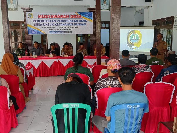 suaramerahputih.id // Tulungagung, 19 Agustus 2025 – Pemerintah Desa Manding, Kecamatan Pucanglaban, Kabupaten Tulungagung, menggelar Musyawarah Desa (Musdes) dalam rangka perencanaan penggunaan Dana Desa tahun 2025 untuk program ketahanan pangan. Kegiatan tersebut berlangsung di aula Balai Desa Manding pada Selasa (19/8/2025) mulai pukul 13.00 WIB hingga selesai.