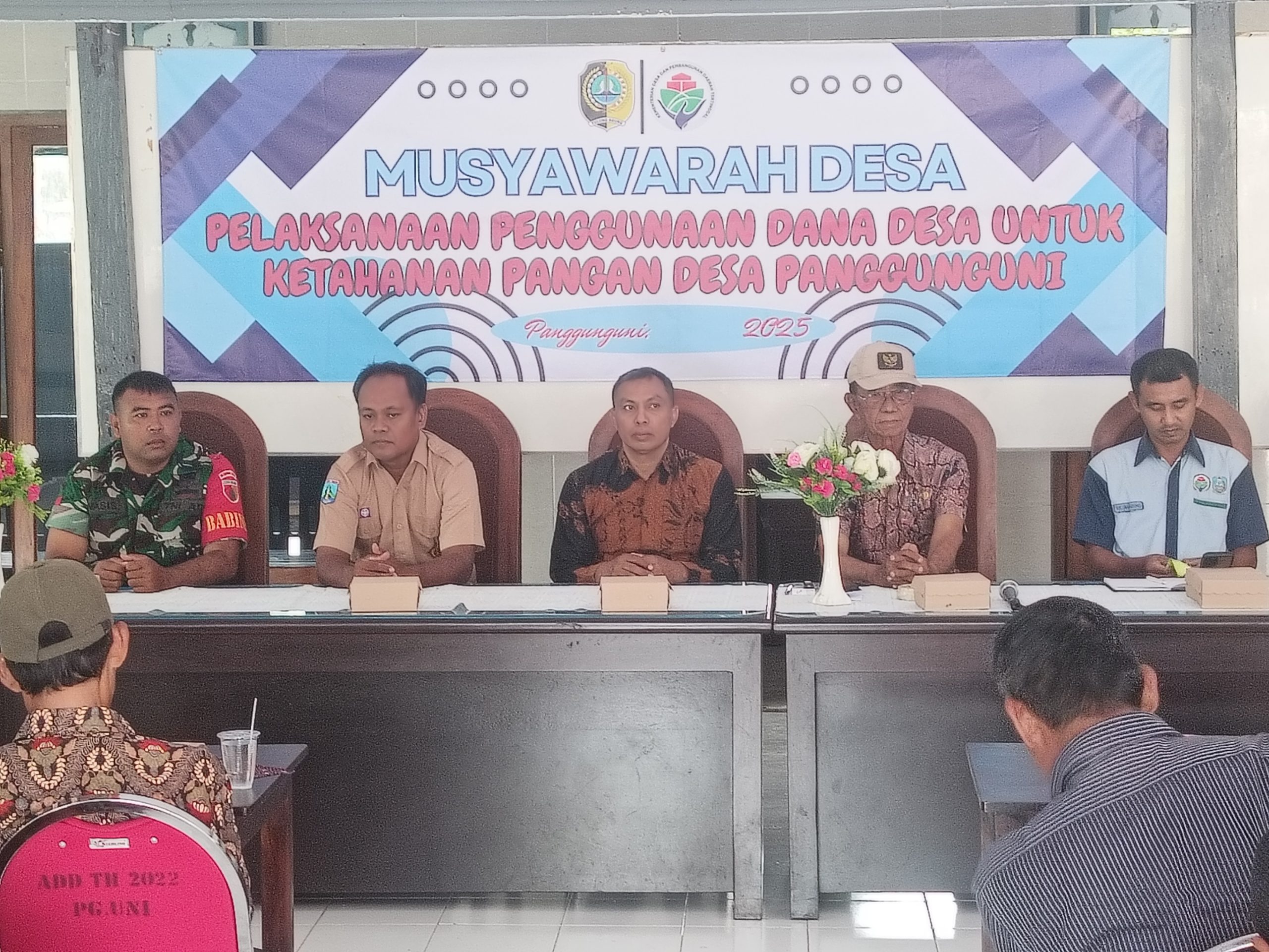 suaramerahputih.id // Tulungagung, 14 Agustus 2025 – Pemerintah Desa Panggunguni, Kecamatan Pucanglaban, Kabupaten Tulungagung menggelar musyawarah desa terkait pelaksanaan penggunaan Dana Desa untuk ketahanan pangan, Kamis (14/8/2025) di aula balai desa setempat. Acara yang dimulai pukul 09.00 WIB ini dihadiri oleh Kasi PMD Kecamatan Pucanglaban, Nurkolis, Kepala Desa Panggunguni Usman beserta perangkat desa, Babinsa, pendamping desa, BPD, LPM, TP PKK, pengurus BUMDesa, tokoh masyarakat dan agama, karang taruna, serta tamu undangan lainnya.