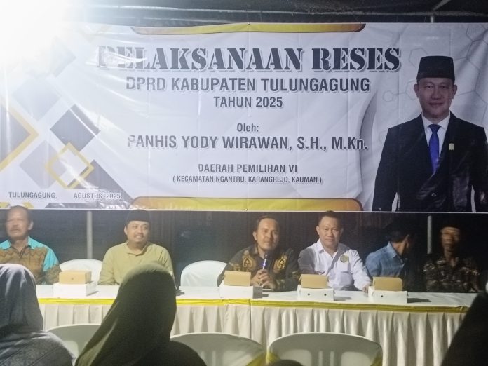suaramerahputih.id // Tulungagung, 14 Agustus 2025 – Anggota Komisi B DPRD Tulungagung, Panhis Yody Wirawan, menggelar kegiatan reses untuk menyerap aspirasi masyarakat di Daerah Pemilihan (Dapil) VI yang meliputi Kecamatan Ngantru, Karangrejo, dan Kauman. Dalam kesempatan itu, ia menegaskan komitmennya untuk menjadi penghubung antara warga dan pemerintah melalui jalur legislatif secara bertahap.