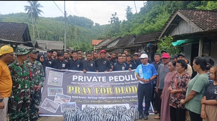 suaramerahputih.id // TULUNGAGUNG – Kepedulian terhadap sesama kembali ditunjukkan oleh Persaudaraan Setia Hati Terate (PSHT) Ranting Pucanglaban, Cabang Tulungagung Pusat Madiun. Melalui kegiatan bakti sosial bertajuk “Privat Peduli: Pray for Dlodo”, PSHT menyalurkan puluhan paket sembako kepada warga Dusun Dlodo, Desa Panggungkalak, Kecamatan Pucanglaban, yang terdampak bencana banjir.