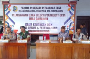Sebanyak enam calon perangkat desa mengikuti ujian yang diselenggarakan oleh panitia pengisian perangkat desa setempat. Hadir dalam kegiatan ini Forkopimcam Pagerwojo, Kepala Desa Gambiran beserta perangkat desa, BPD, LPM, serta tim penguji dari Universitas Islam Balitar (Unisba) Blitar, yang dipercaya sebagai pihak ketiga penyusun dan penyelenggara ujian.